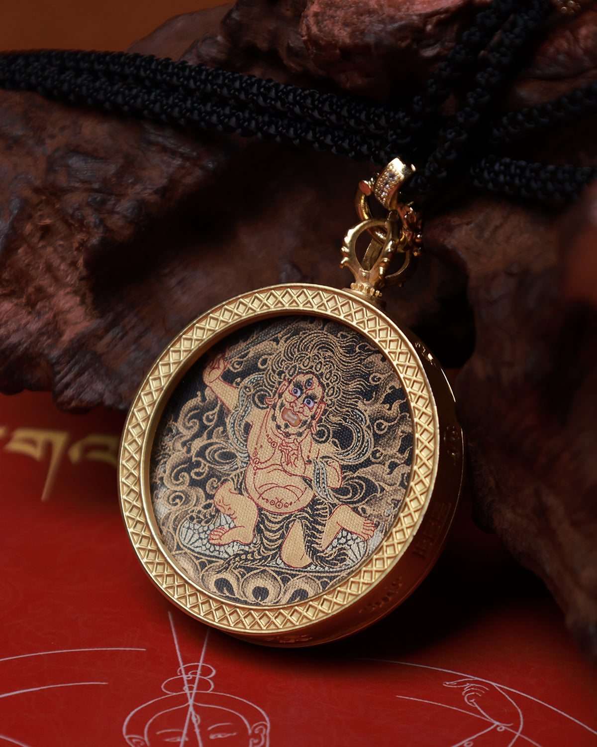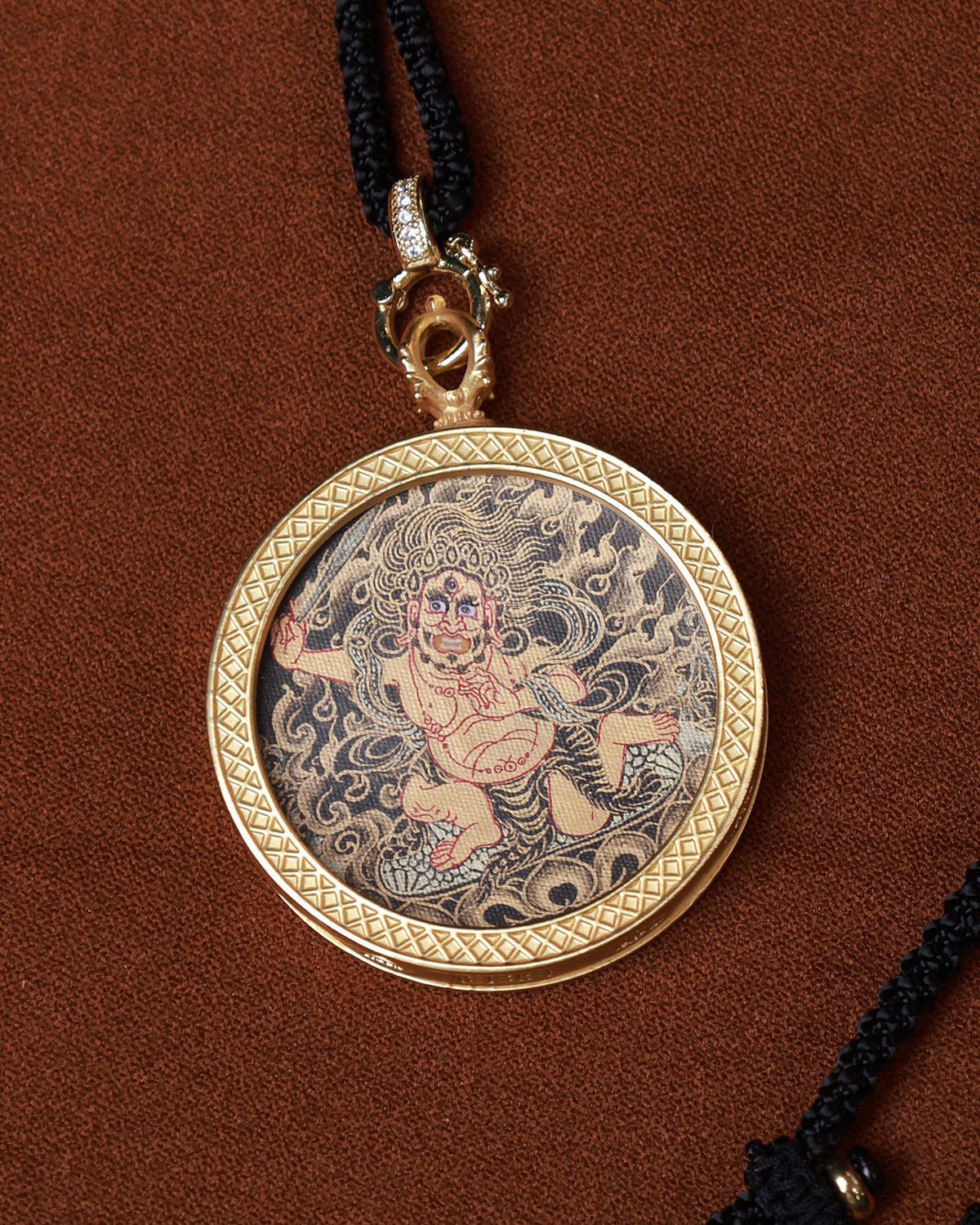 • Background: Dynamic flaming patterns and auspicious clouds envelop the figure; gold powder in the flames and clouds mimics the radiance of divine power, highlighting the fierce yet compassionate protective energy.