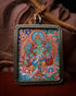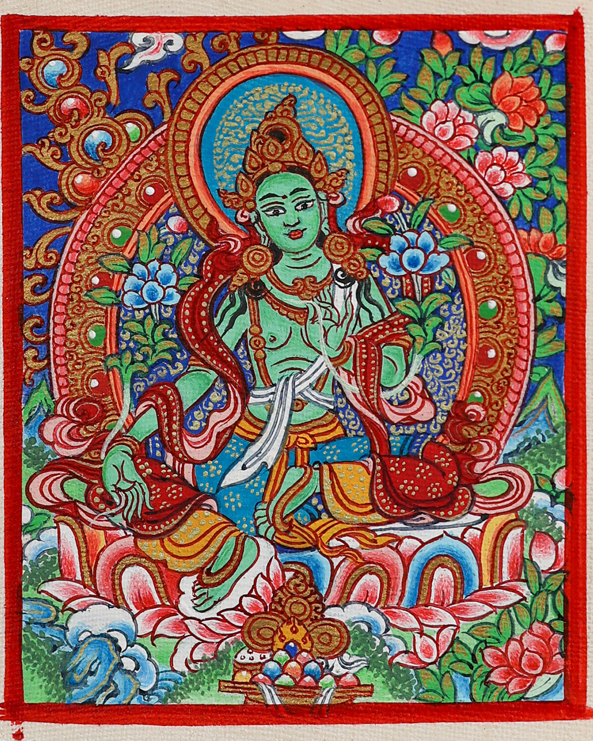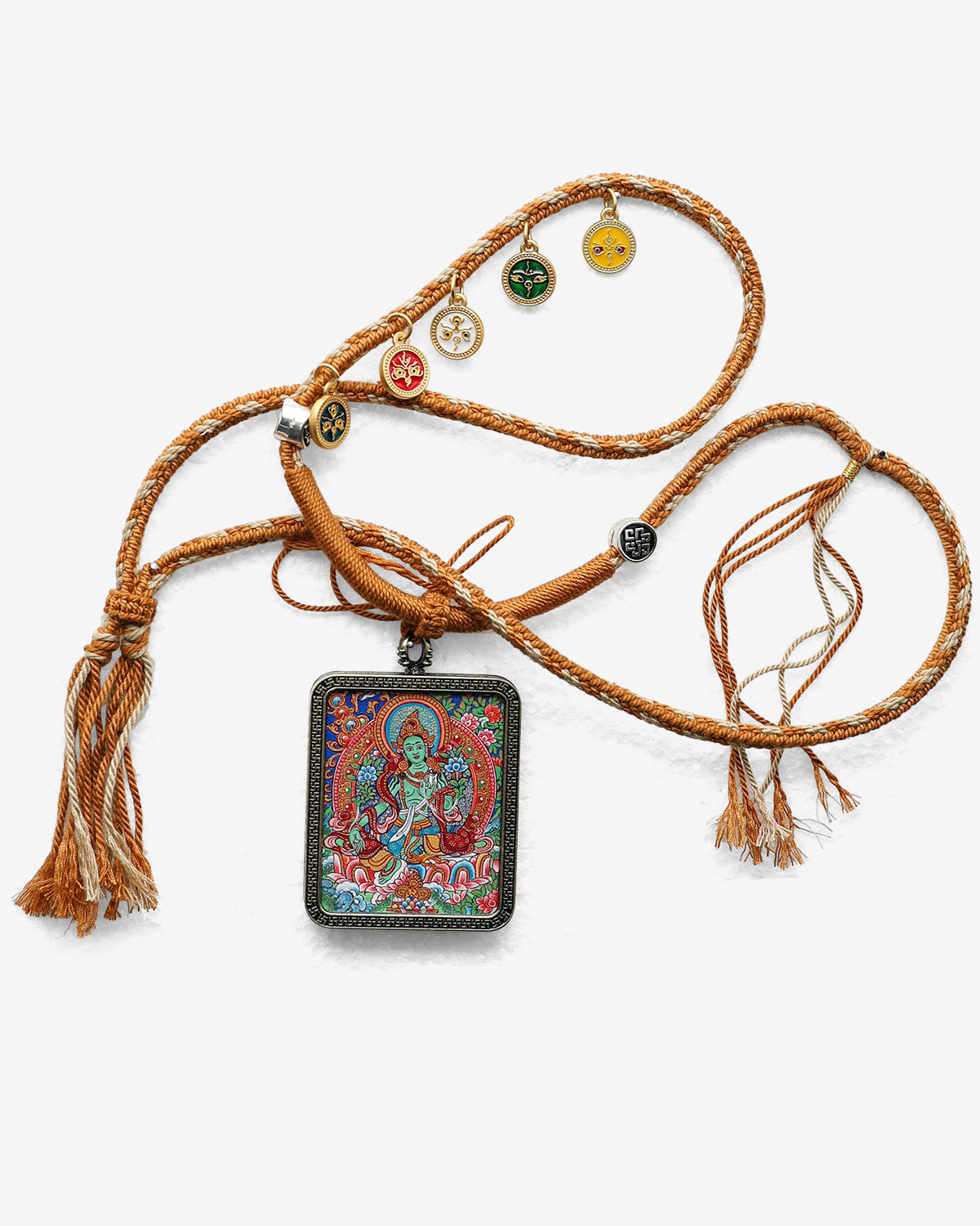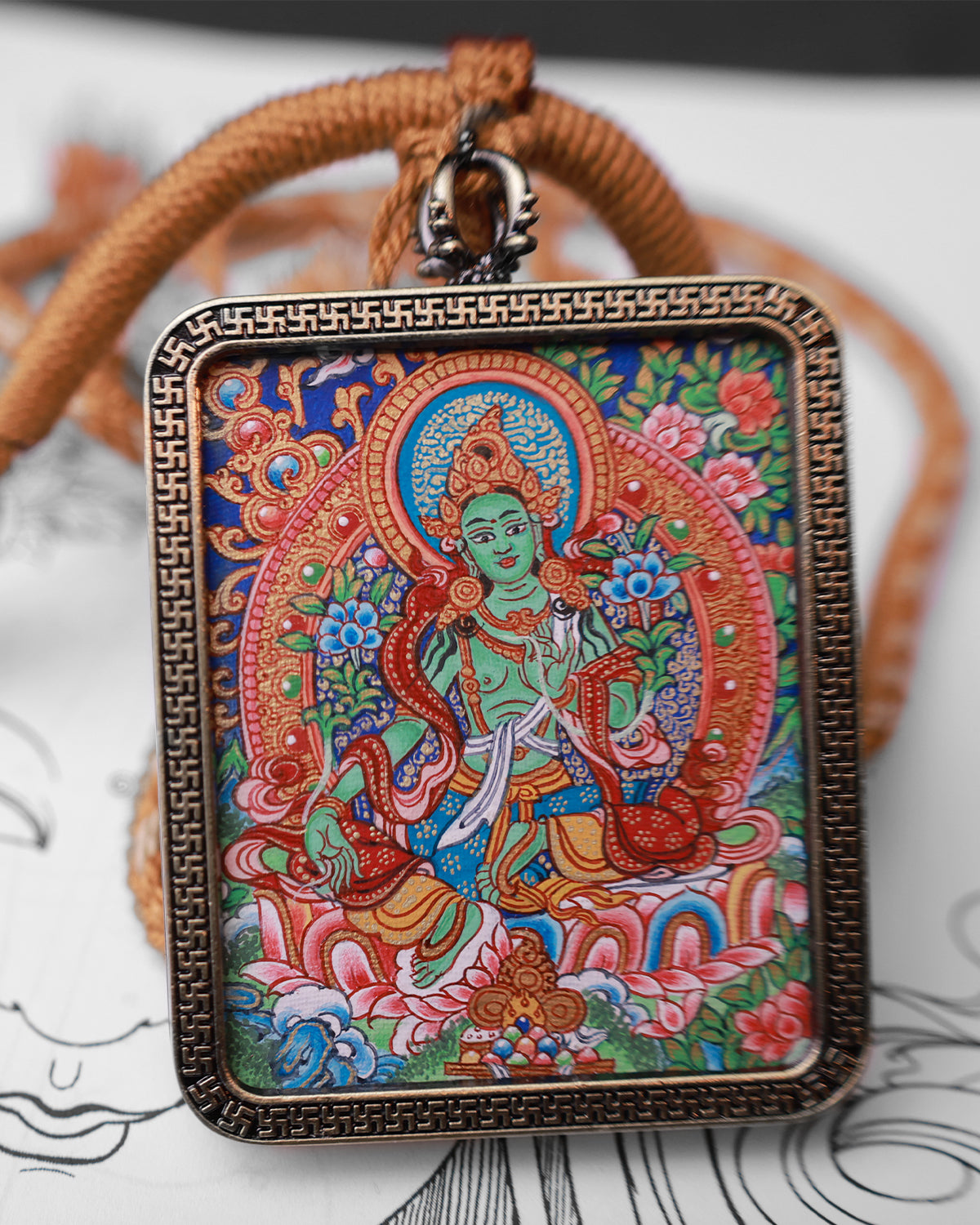 Centered on a sacred thangka of Green Tara, this amulet is hand-painted using natural mineral pigments in traditional style. Her jade-green form symbolizes vitality and hope, adorned with a five-Buddha crown and holding a blue Utpala lotus. With her right hand forming the Boons-Granting Mudra, she offers fearlessness and fulfills wishes, seated gracefully on a layered lotus throne—poised to aid beings in need. Set against a deep blue background enriched with golden scrolls and pink lotuses, the composition reflects her compassionate wisdom and protective grace.