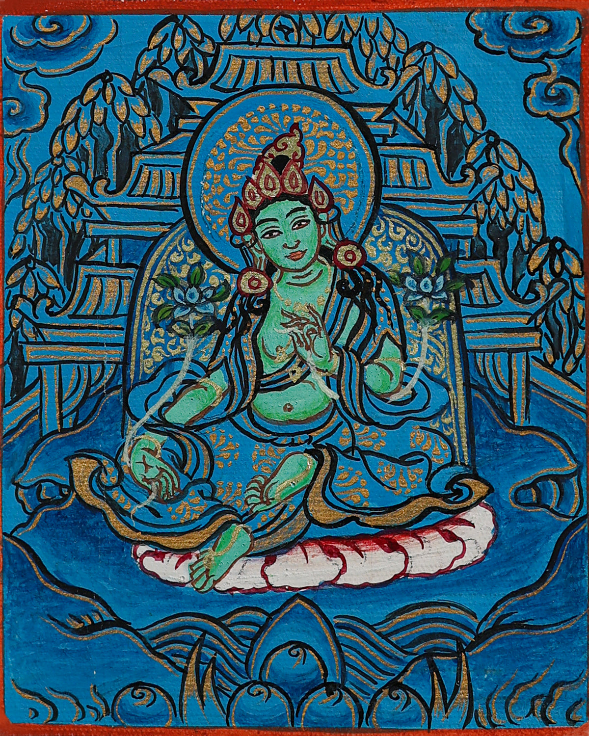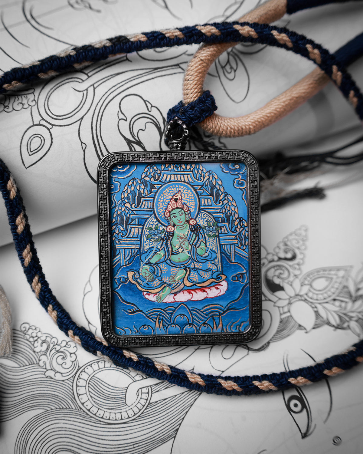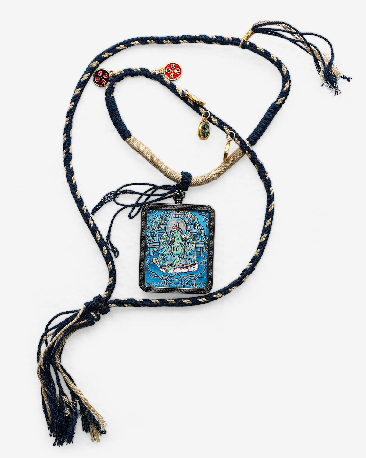At the heart of this amulet lies a meticulously hand-painted thangka of Green Tara, created using natural mineral pigments. Her serene and compassionate form is depicted with a jade-green body, symbolizing vitality and hope, and a five-Buddha crown representing perfect wisdom. She holds a lotus in her left hand, signifying purity and the fulfillment of wishes, while her right hand is in the gesture of granting blessings and dispelling fear. She is seated upon a red and white lotus throne, denoting transcendence over worldly troubles and abiding in compassionate wisdom. The deep blue background, adorned with golden pavilions and clouds, suggests a pure land that supports spiritual growth. The harmonious color palette conveys the profound message of illuminating the path of wisdom with compassion.