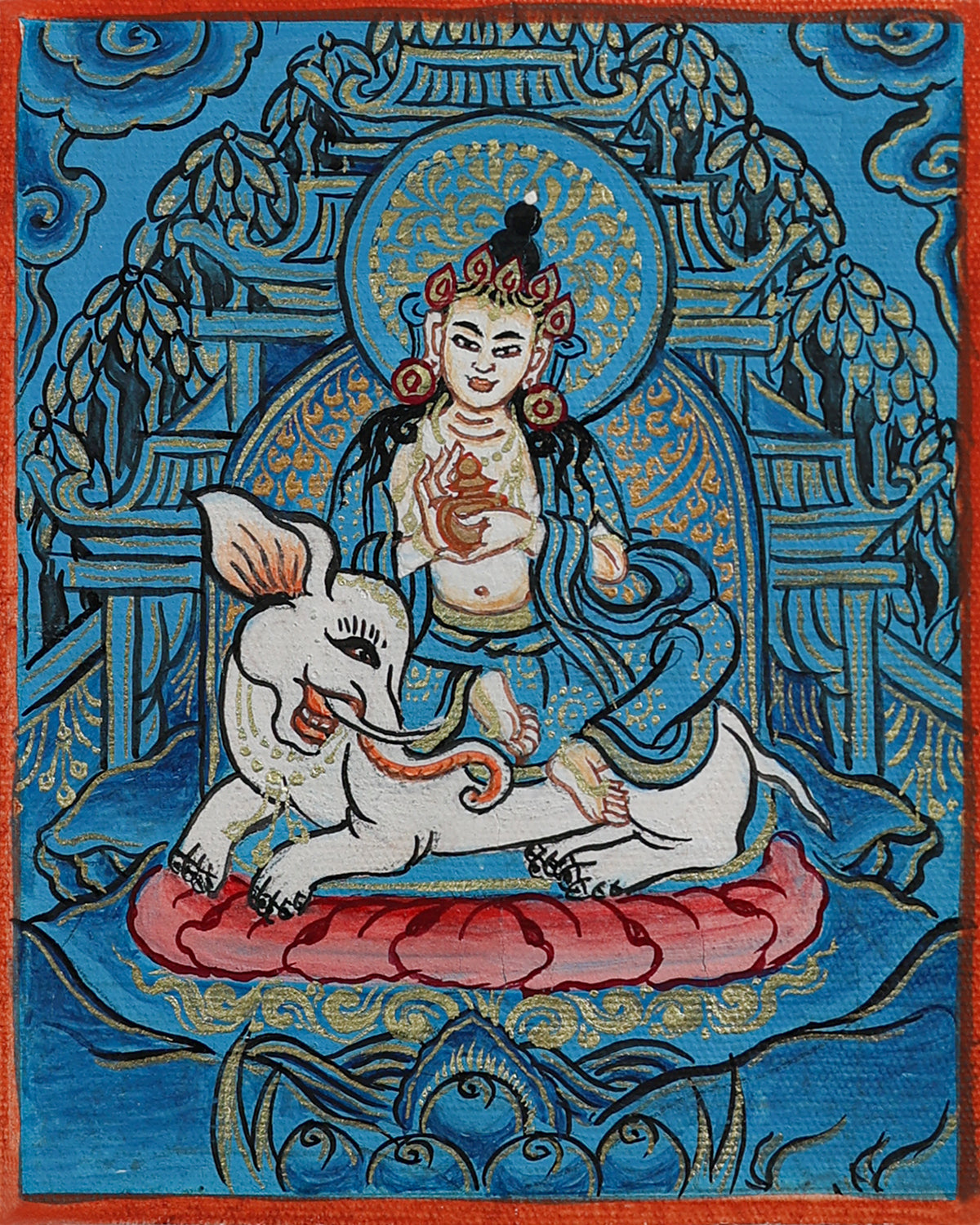 This amulet features a traditional thangka of Samantabhadra Bodhisattva, hand-painted with natural mineral pigments. Depicted with a light blue body and a five-Buddha crown representing perfect wisdom, he holds a ruyi scepter for fulfilling wishes and forms the Dharma mudra symbolizing great vows. He sits serenely on a six-tusked white elephant—emblematic of diligent practice—standing on a lotus seat denoting purity. Against a deep blue background with golden pavilions and clouds, the artwork conveys protection for enduring growth in virtue and wisdom.