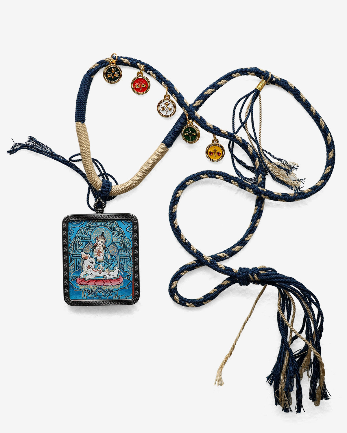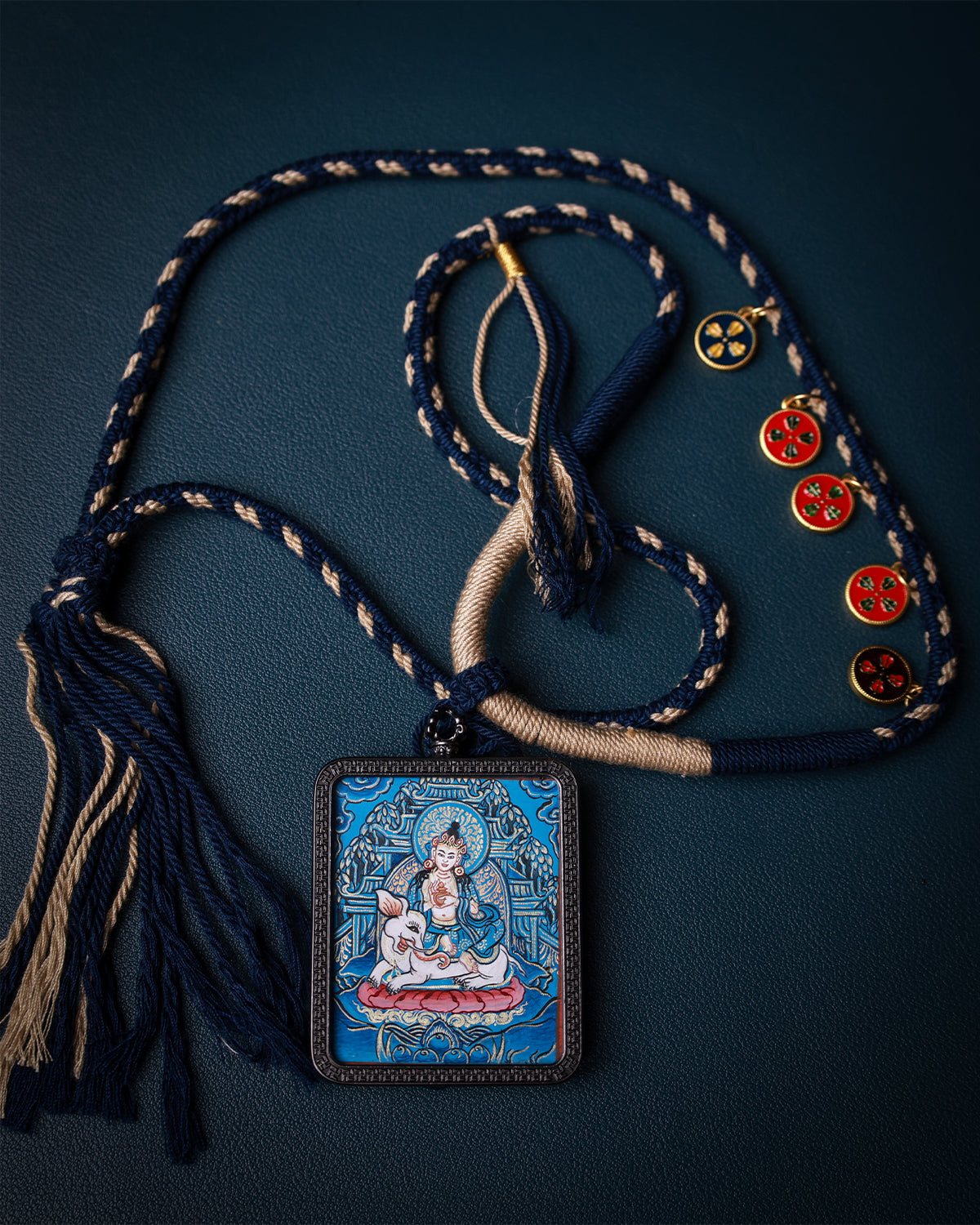 The thangka is set in a dark brown carved alloy frame for protection and rustic elegance. It comes with a braided cord in navy blue and off-white, accented with Buddhist charms that symbolize the pursuit of virtue and wisdom.