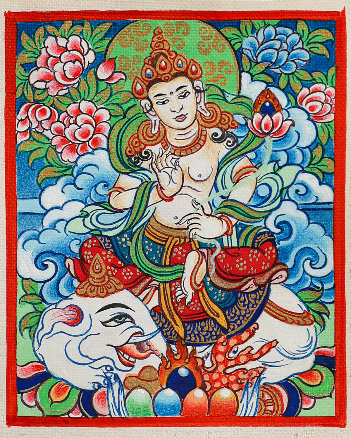 Centered on a sacred image of Samantabhadra Bodhisattva, this thangka is meticulously hand-painted using natural mineral pigments in traditional style. Samantabhadra is depicted with a compassionate expression, riding a white elephant symbolizing great vows and diligent practice. He holds auspicious objects, set against a background rich with peonies, clouds, and other symbolic patterns. Soft pinks, blues, greens, and gold tones blend harmoniously, conveying a message of guiding beings toward goodness and protecting the growth of virtue and wisdom.