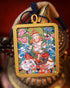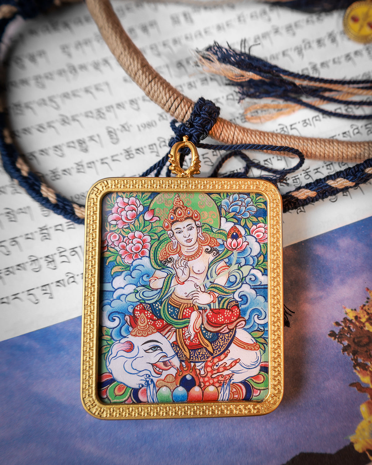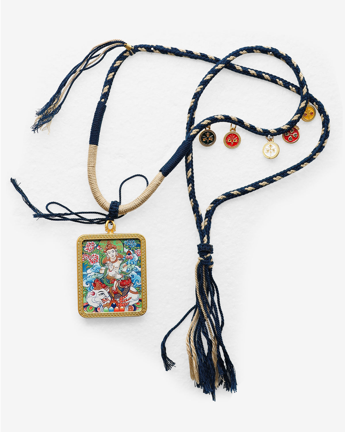The thangka is framed in a golden alloy with finely carved edges, offering protection while enhancing its dignified presence. It is paired with a braided cord and Buddhist charms, such as auspicious symbols, reinforcing the theme of cultivating virtue and wisdom. This combination makes the amulet both meaningful and practical for daily wear.