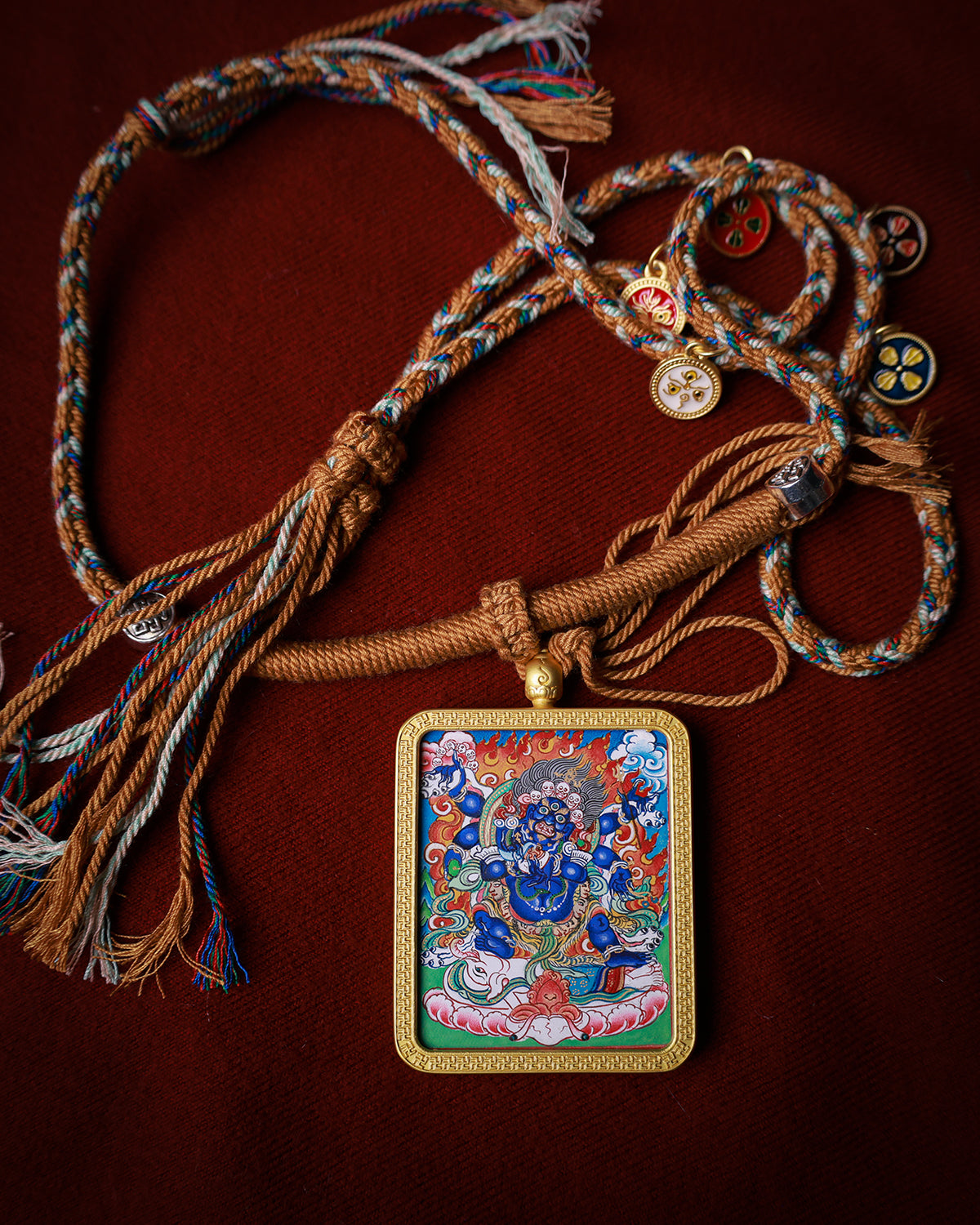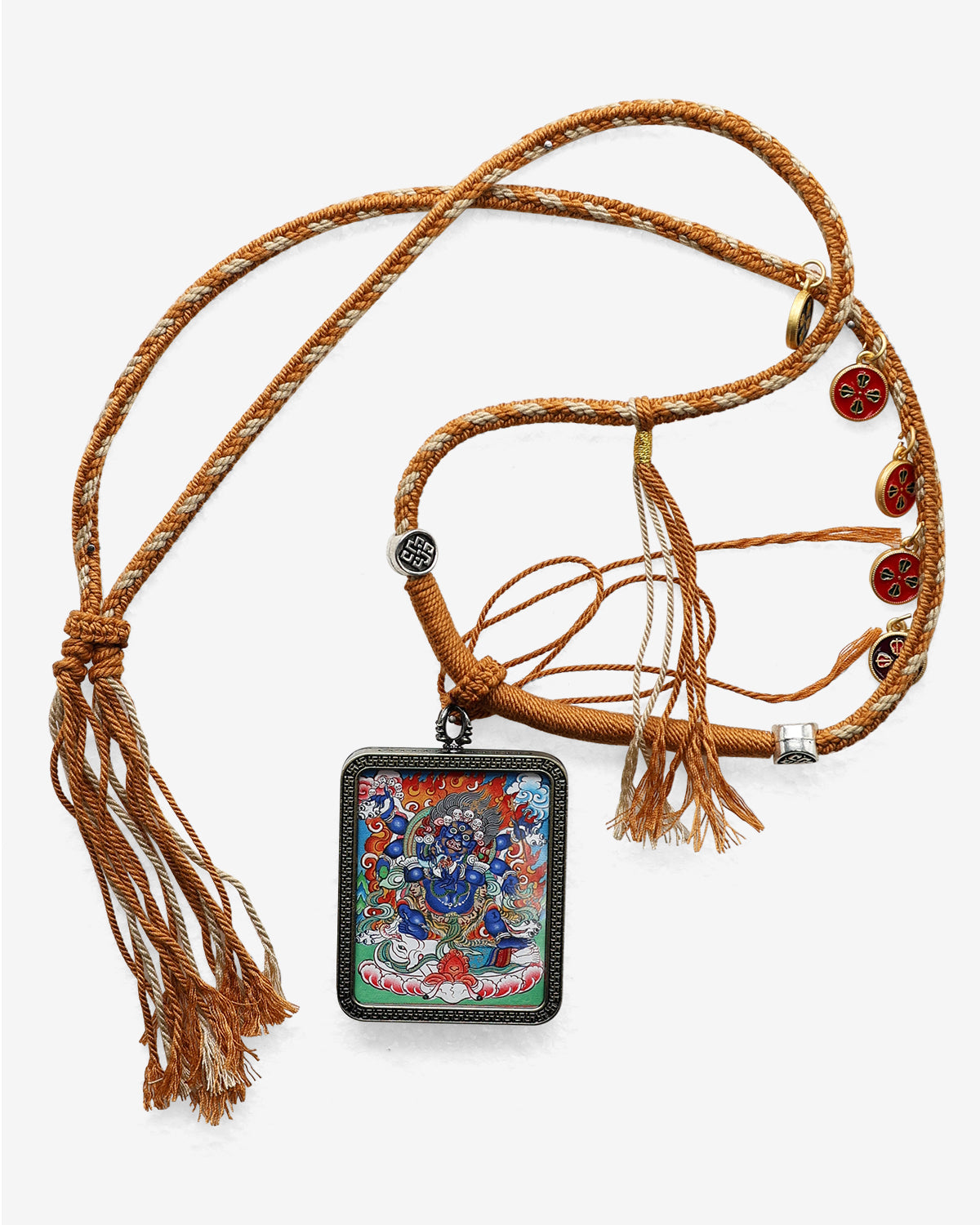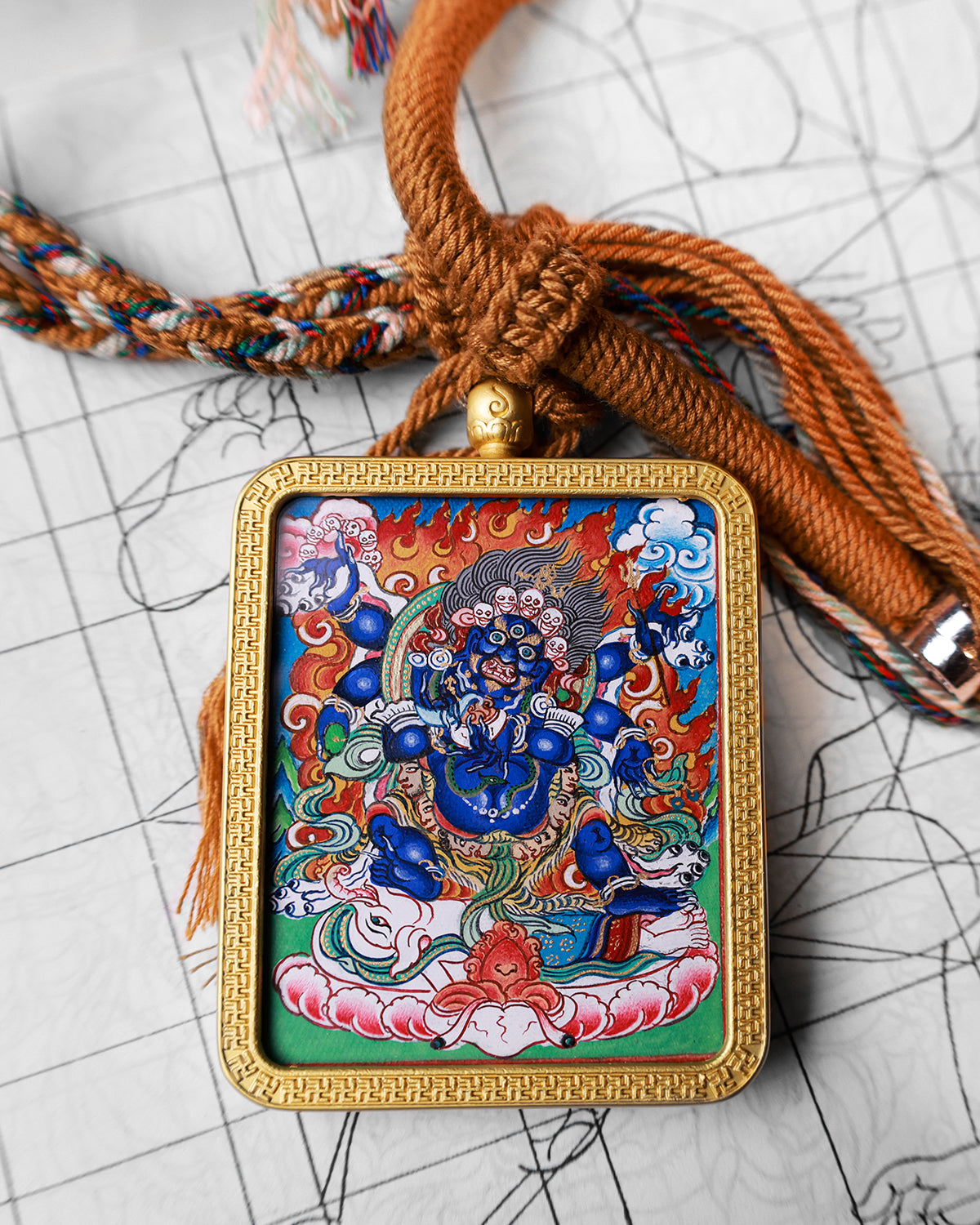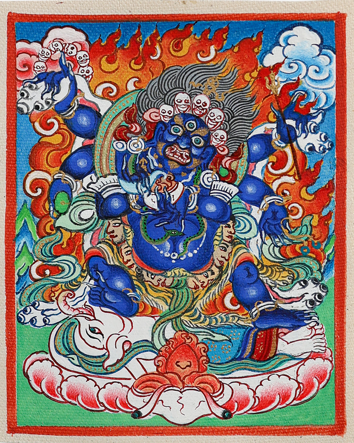 • Key Features: Deep blue body, five-skull crown; six arms hold ritual implements ; sits in vajra posture on a lotus seat, suppressing a white divine beast