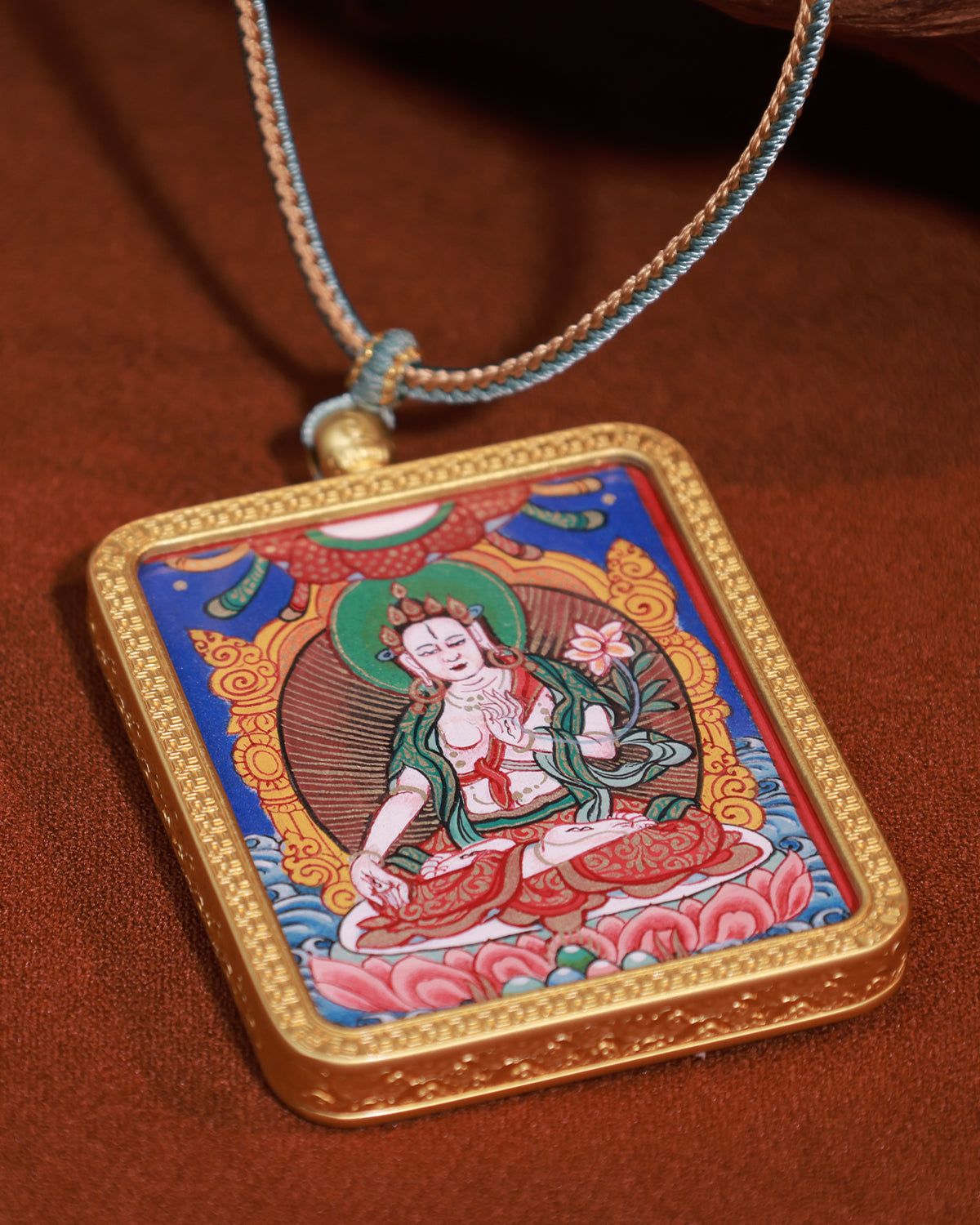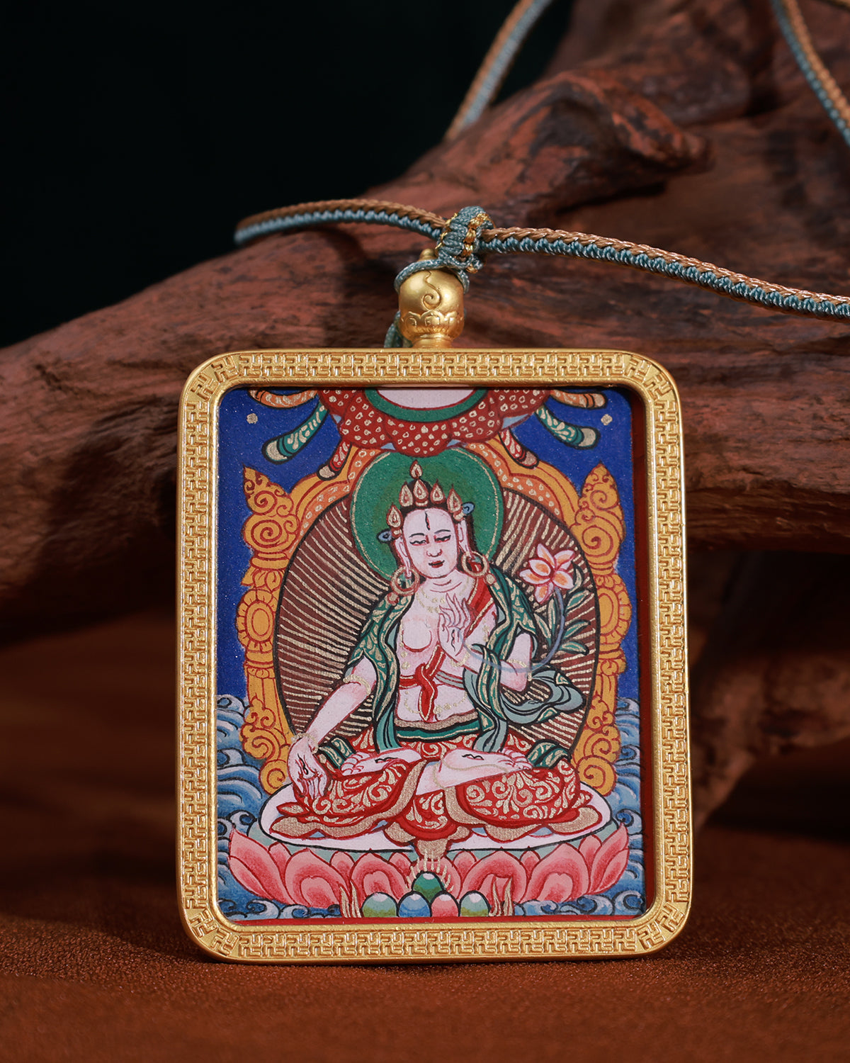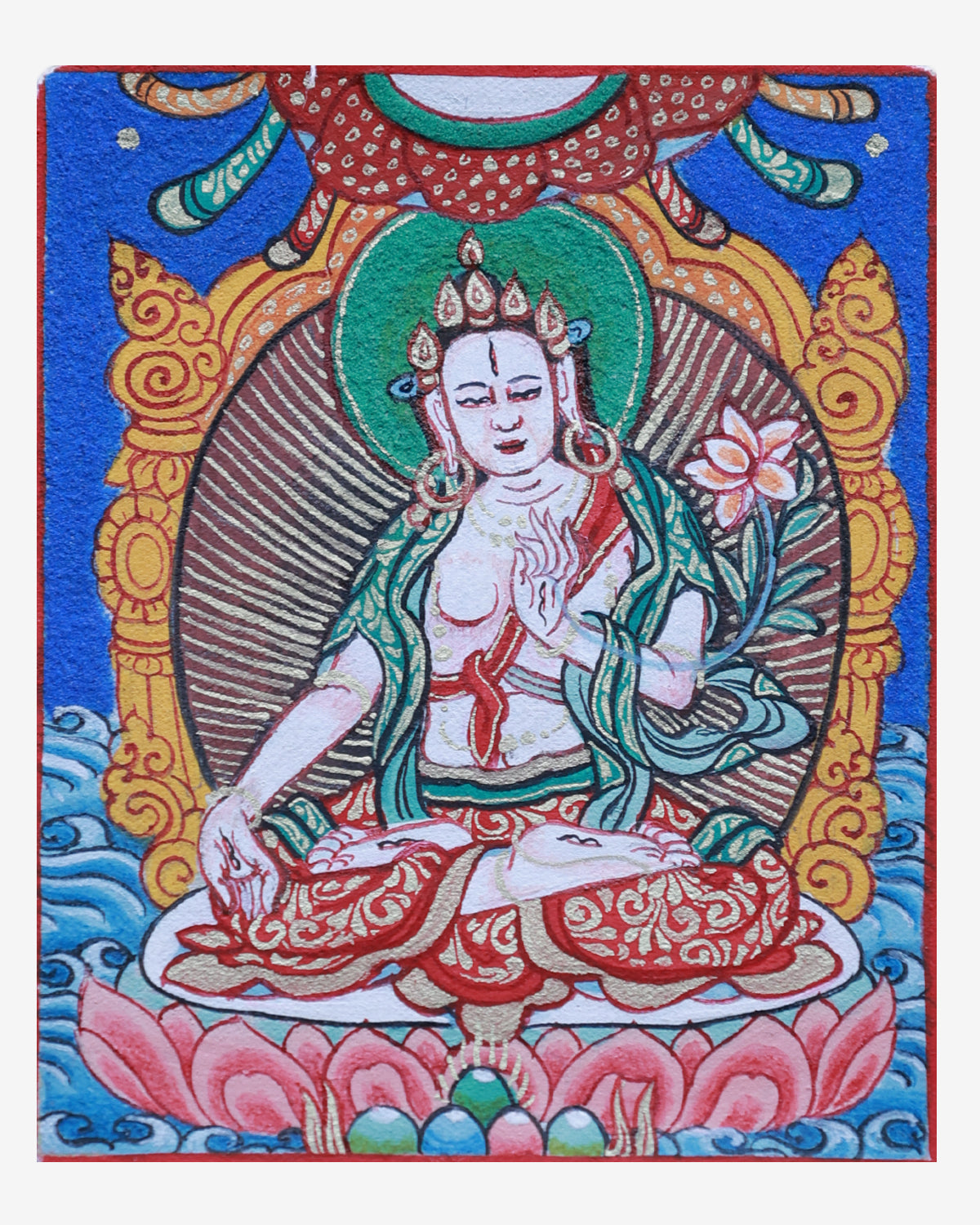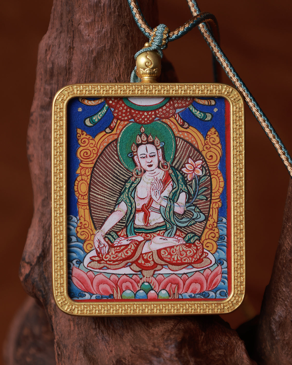 Thangka Core: White Tara, seated on a lotus throne, embodies longevity, profound compassion, and the blessings of wisdom. She is distinguished by her seven eyes (symbolizing insight into the past, present, future, as well as the four cardinal directions and the upward realm), holds symbols of longevity and enlightenment, and displays mudras of blessing and protection. Gold powder accentuates her sacred ornaments, highlighting the divine serenity and auspiciousness.