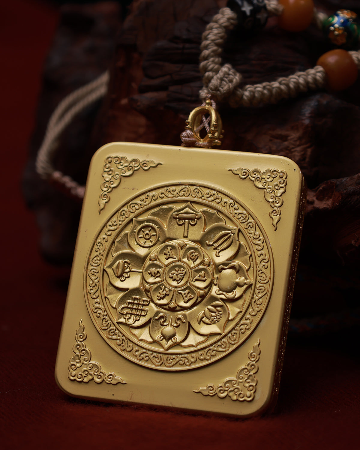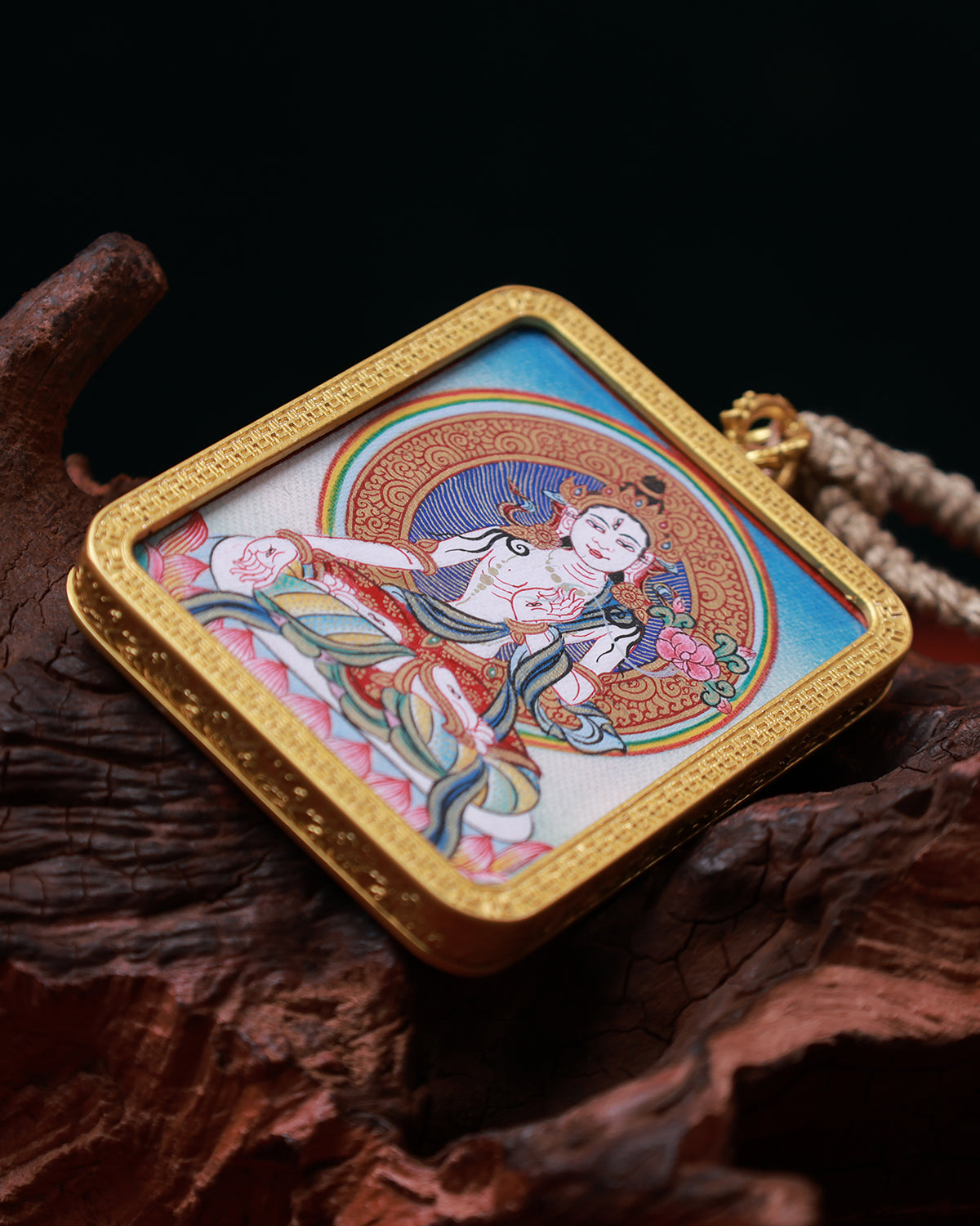 • Background: Auspicious celestial motifs and blessed patterns form a sacred backdrop, with gold details evoking divine radiance that symbolizes the illumination of wisdom and the dispelling of ignorance.