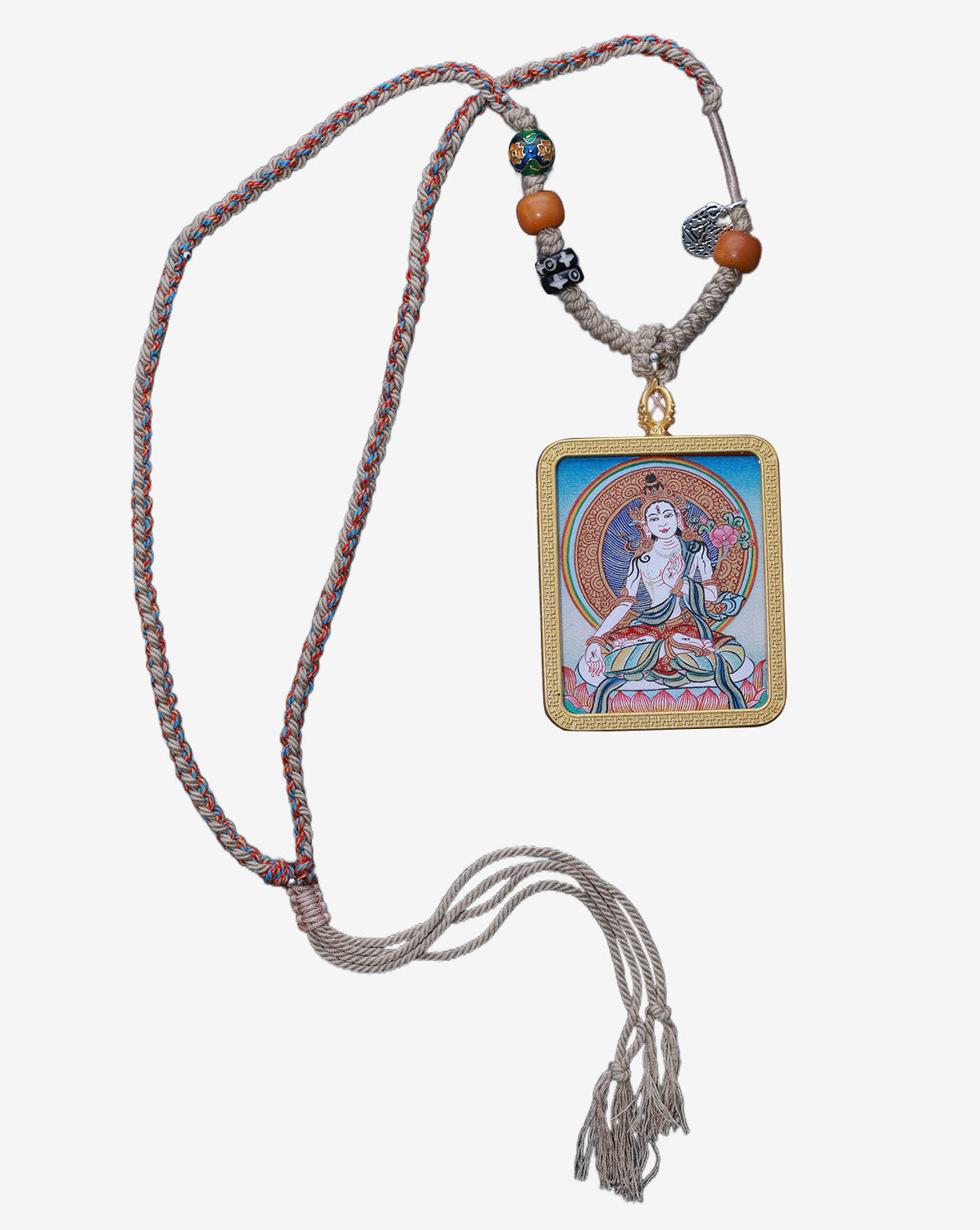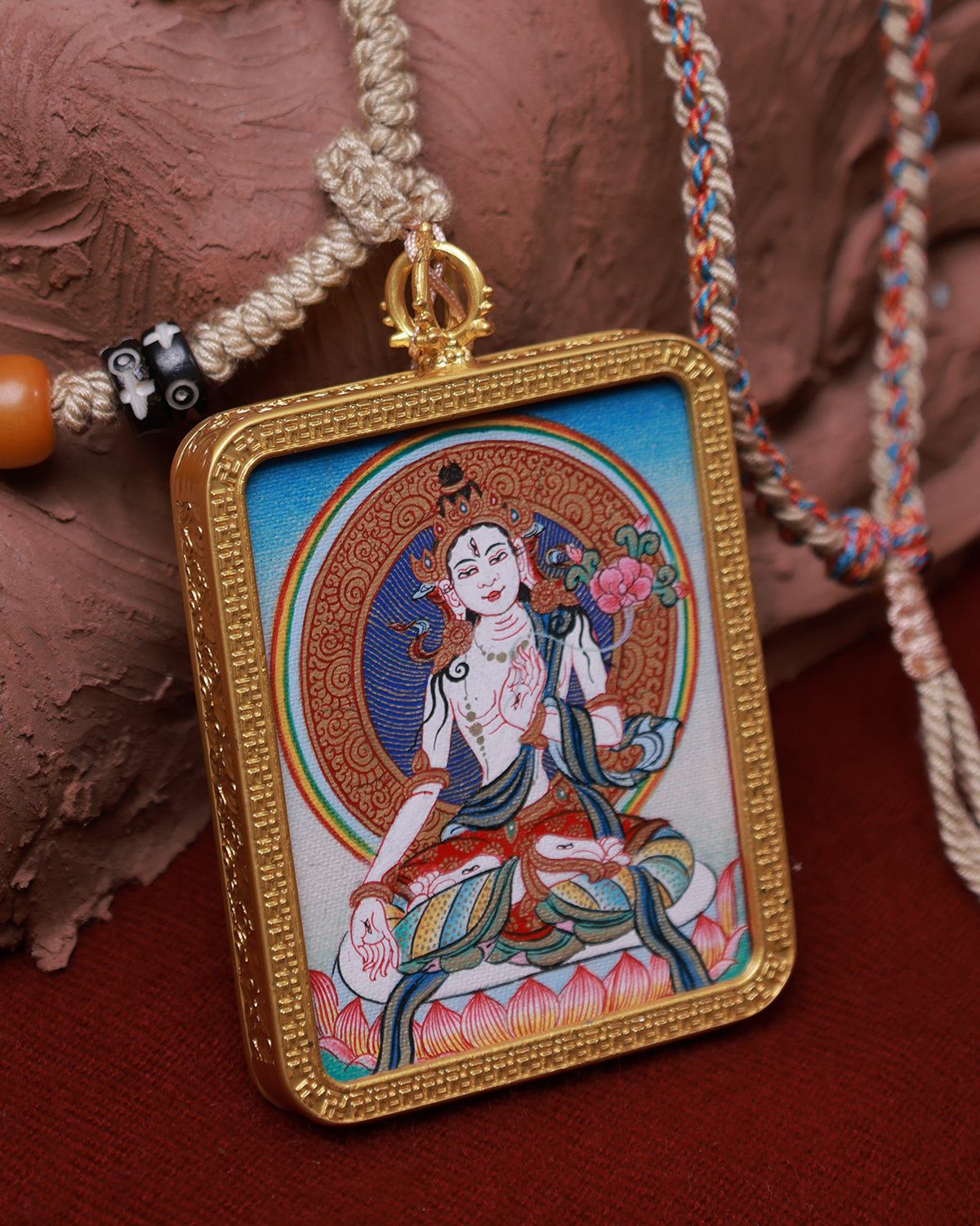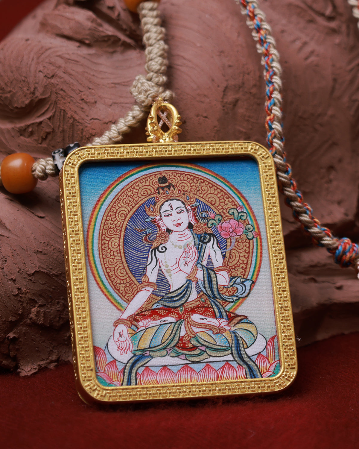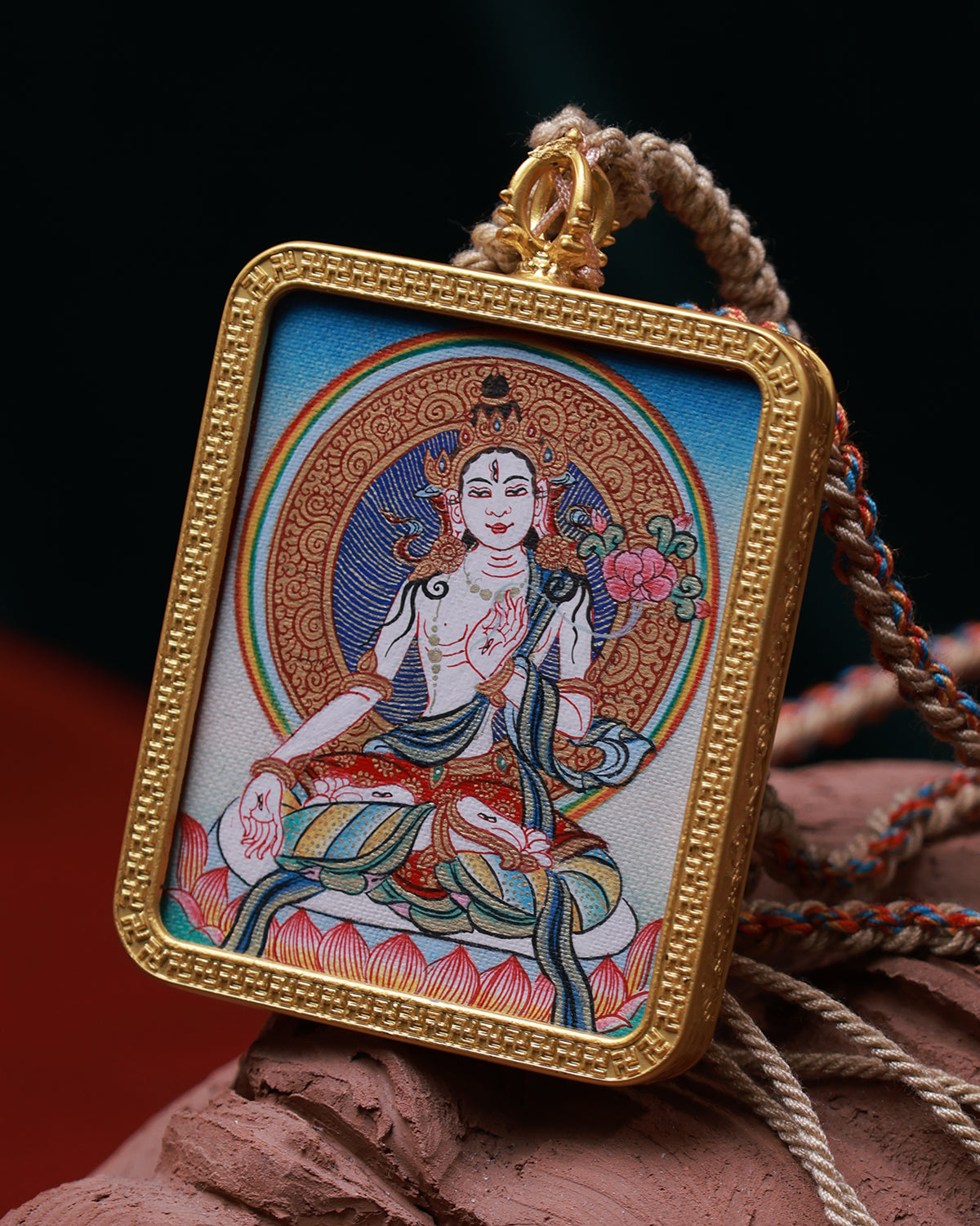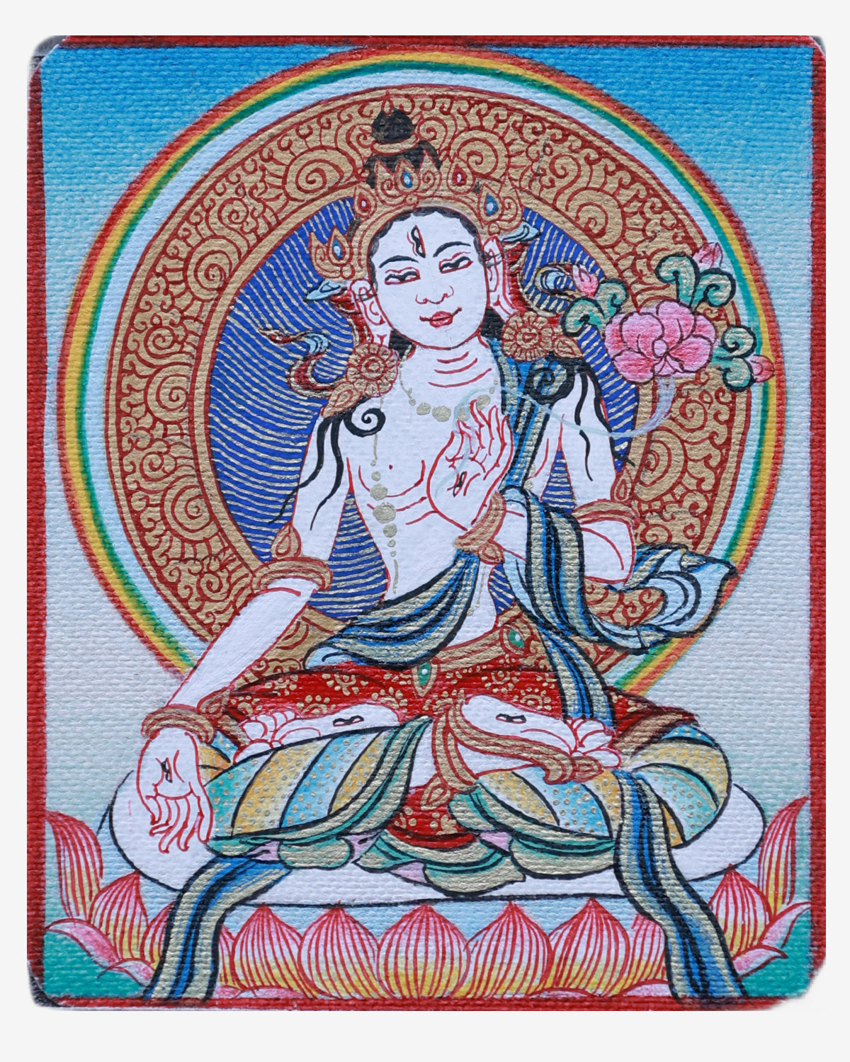 • Thangka Core: White Tara, seated gracefully on a lotus throne, embodies longevity, profound compassion, and the blessings of wisdom. She is distinguished by her seven eyes , holds emblems representing longevity and enlightenment, and displays mudras of blessing and protection. Gold powder accentuates her sacred ornaments, highlighting the divine serenity and auspiciousness.